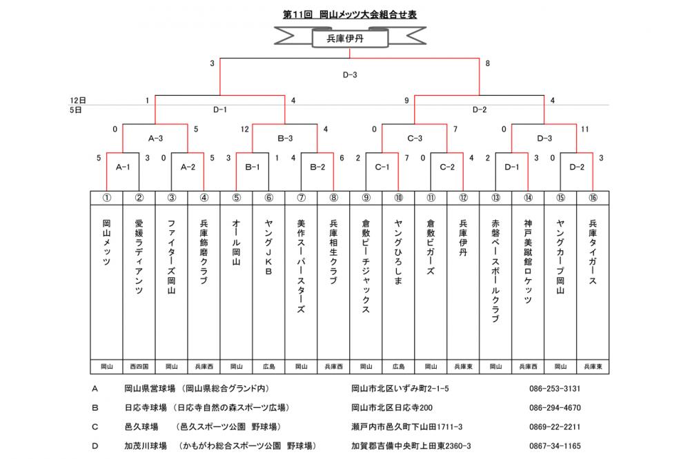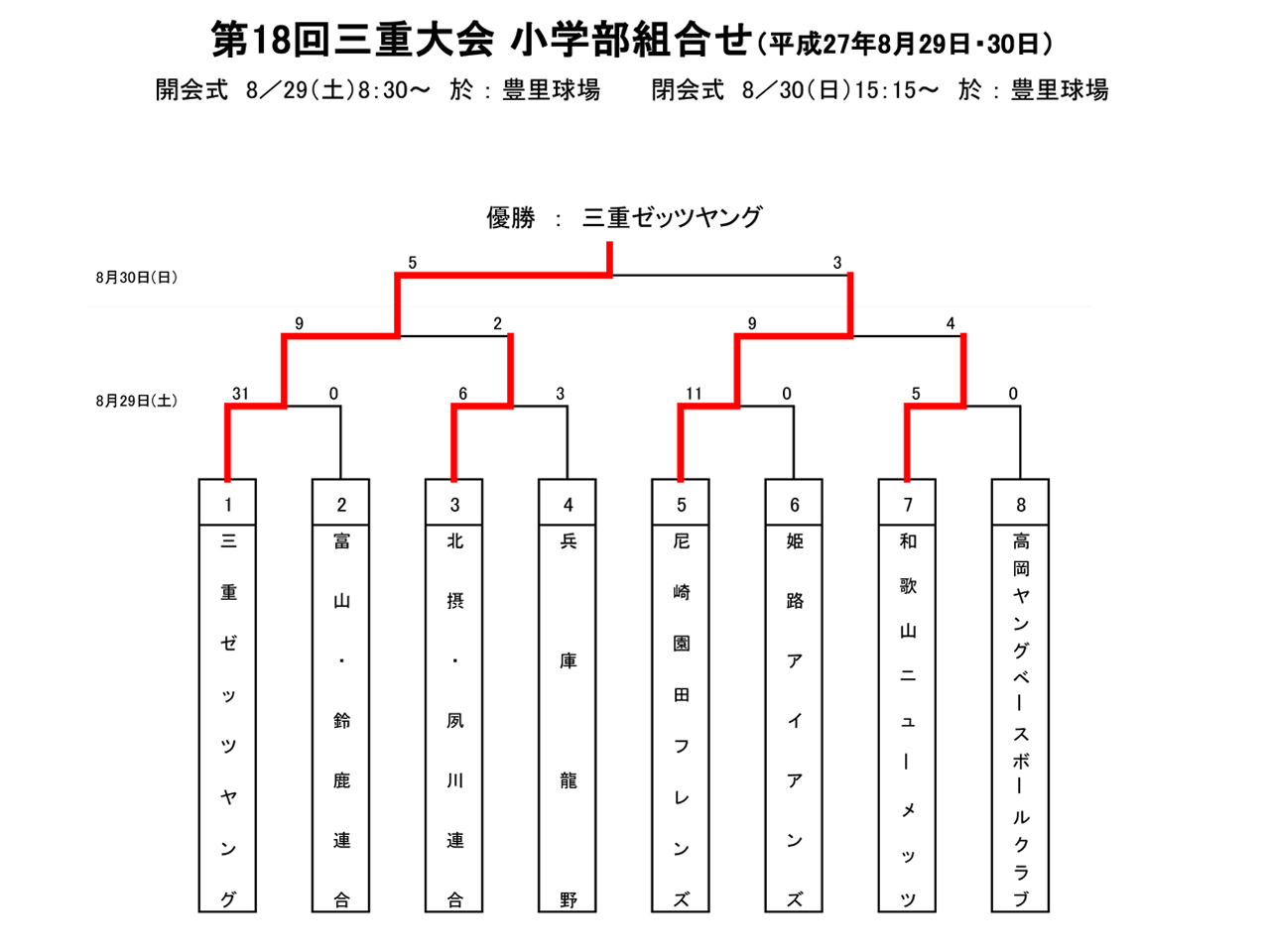 | [3806] 第8回 倉敷国際少年野球大会予選リーグ Name:事務局 Date:2015/08/19(水) 10:42 [ next ] | |||||||||